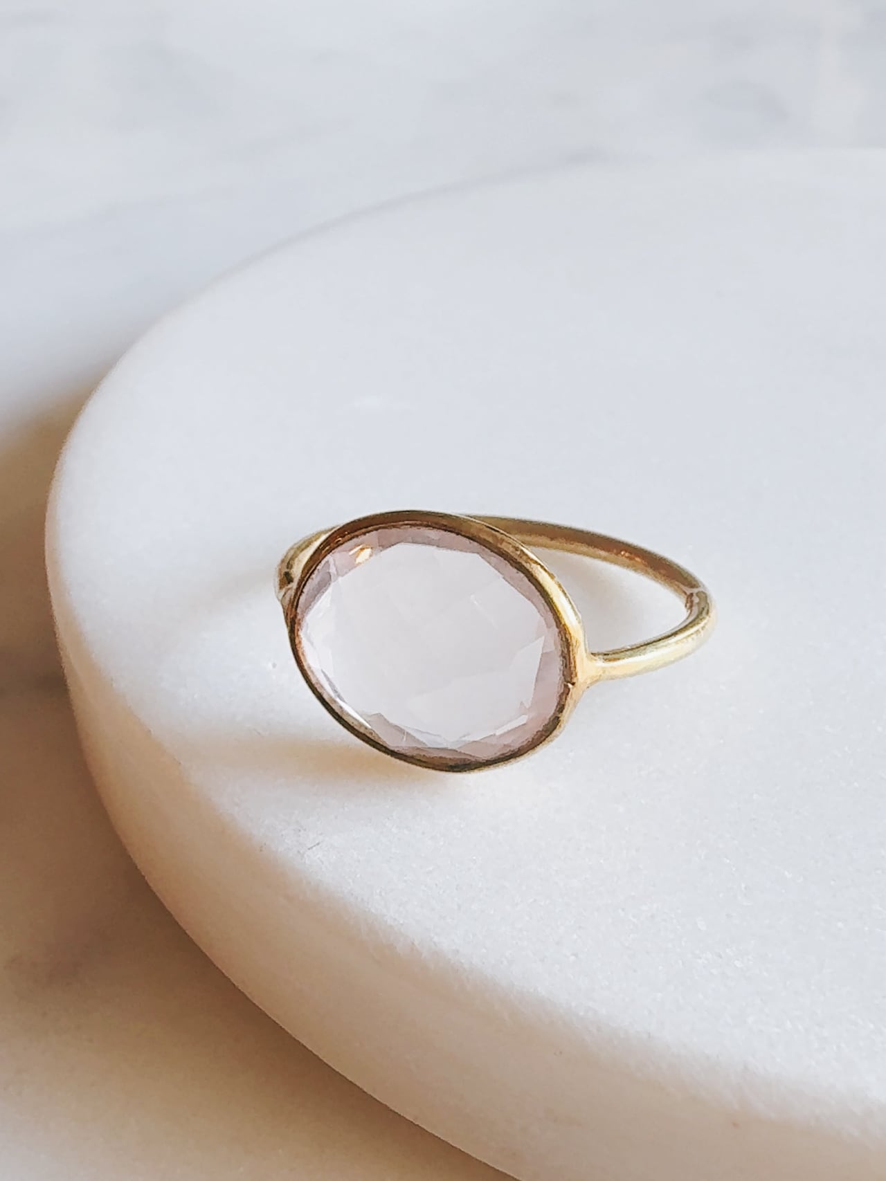 やわらかなピンクの光をまとったローズクォーツのリングです。