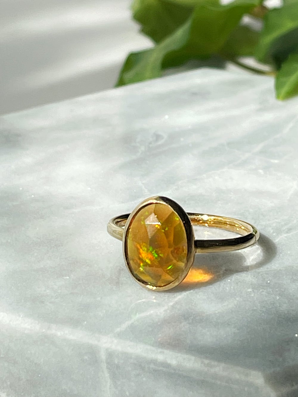 【こちらのメキシコ産ファイヤーオパールは 水分を含む宝石で 熱や乾燥に弱い性質がありますので お取扱いに注意してください。こちらにつきましては、リングのサイズ直しは おうけできません。ご了承ください。】