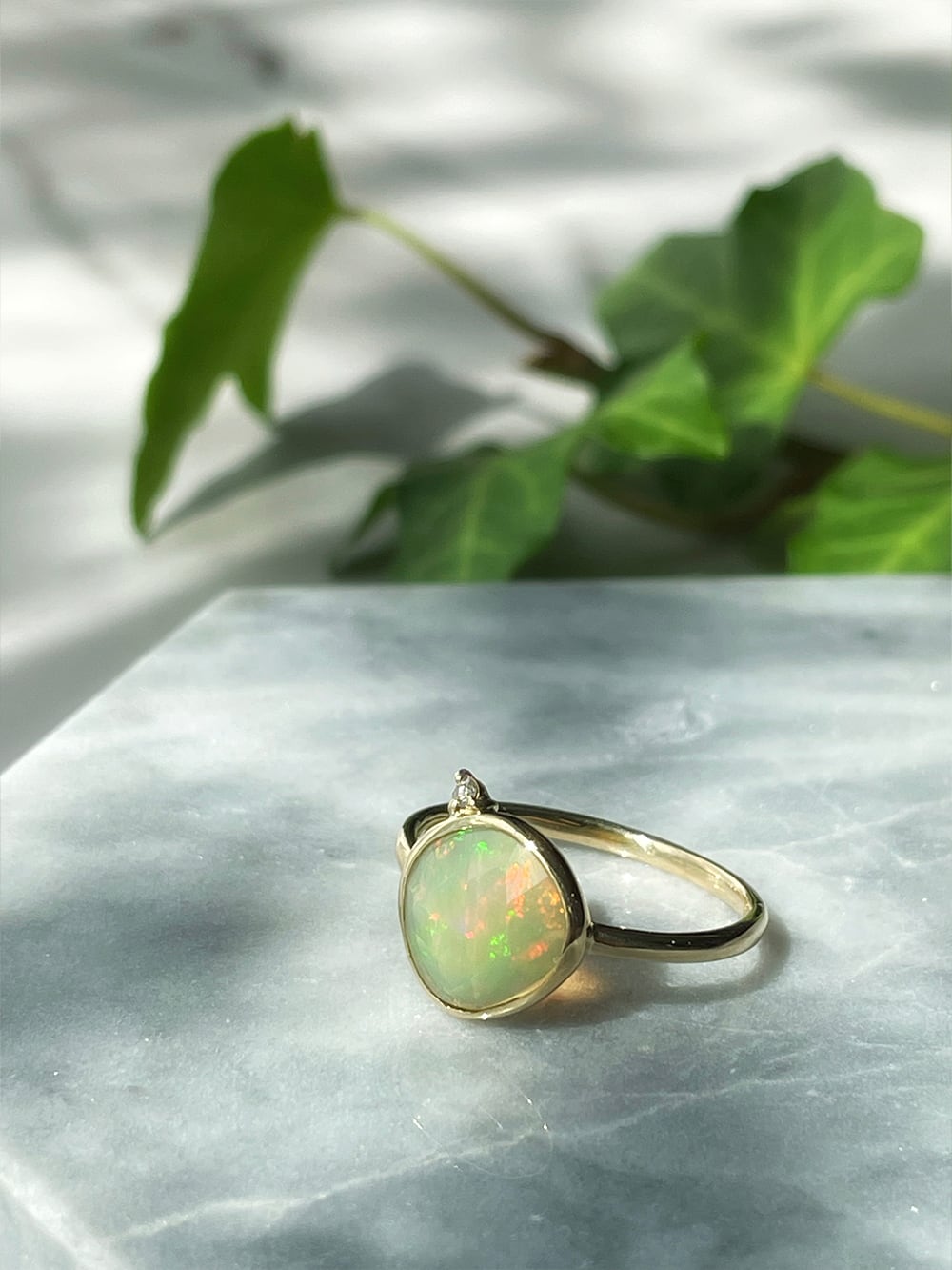 【美しい遊色で定評のあるエチオピアオパールですが、他のオパールと違い水に弱い性質がありますので 水にあたらないように気を付けてご利用ください。また、熱処理にも弱く リングのサイズ直しは おうけできません。ご了承ください。】
