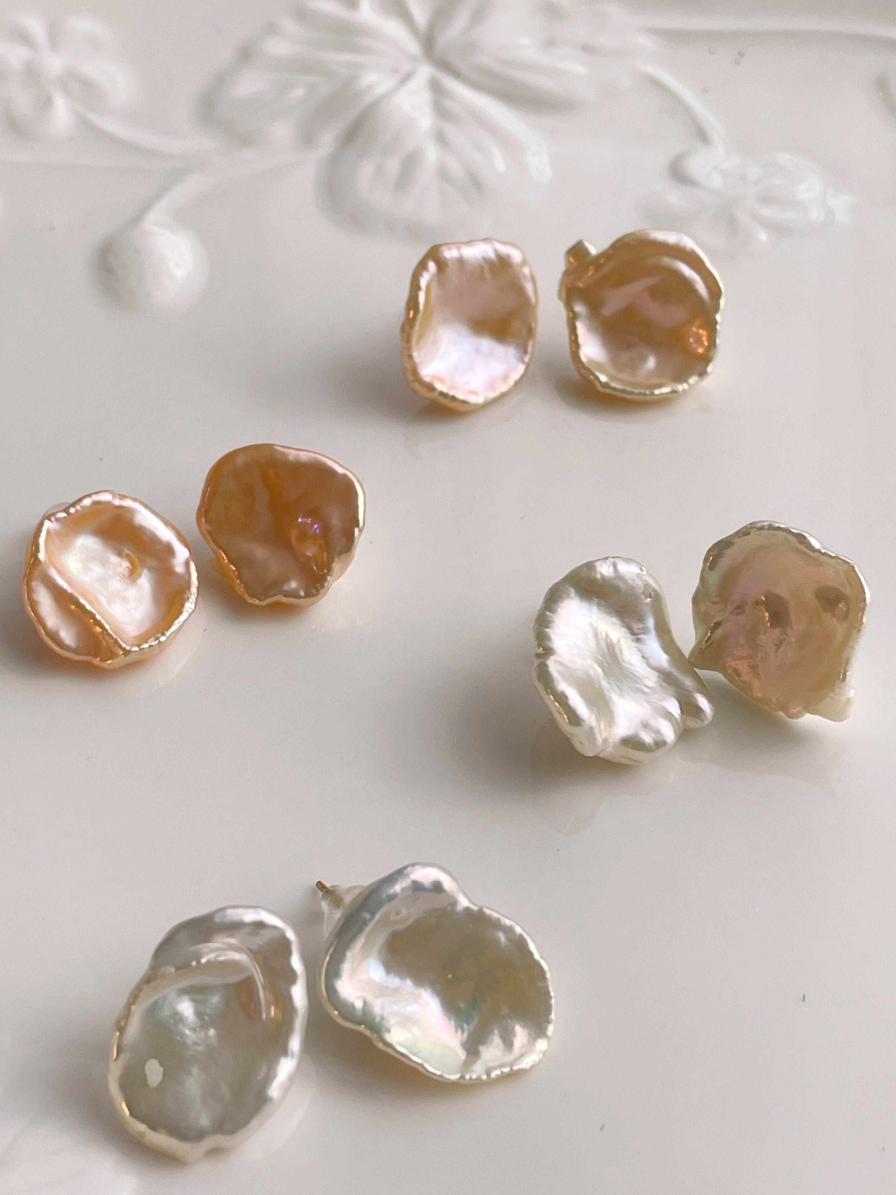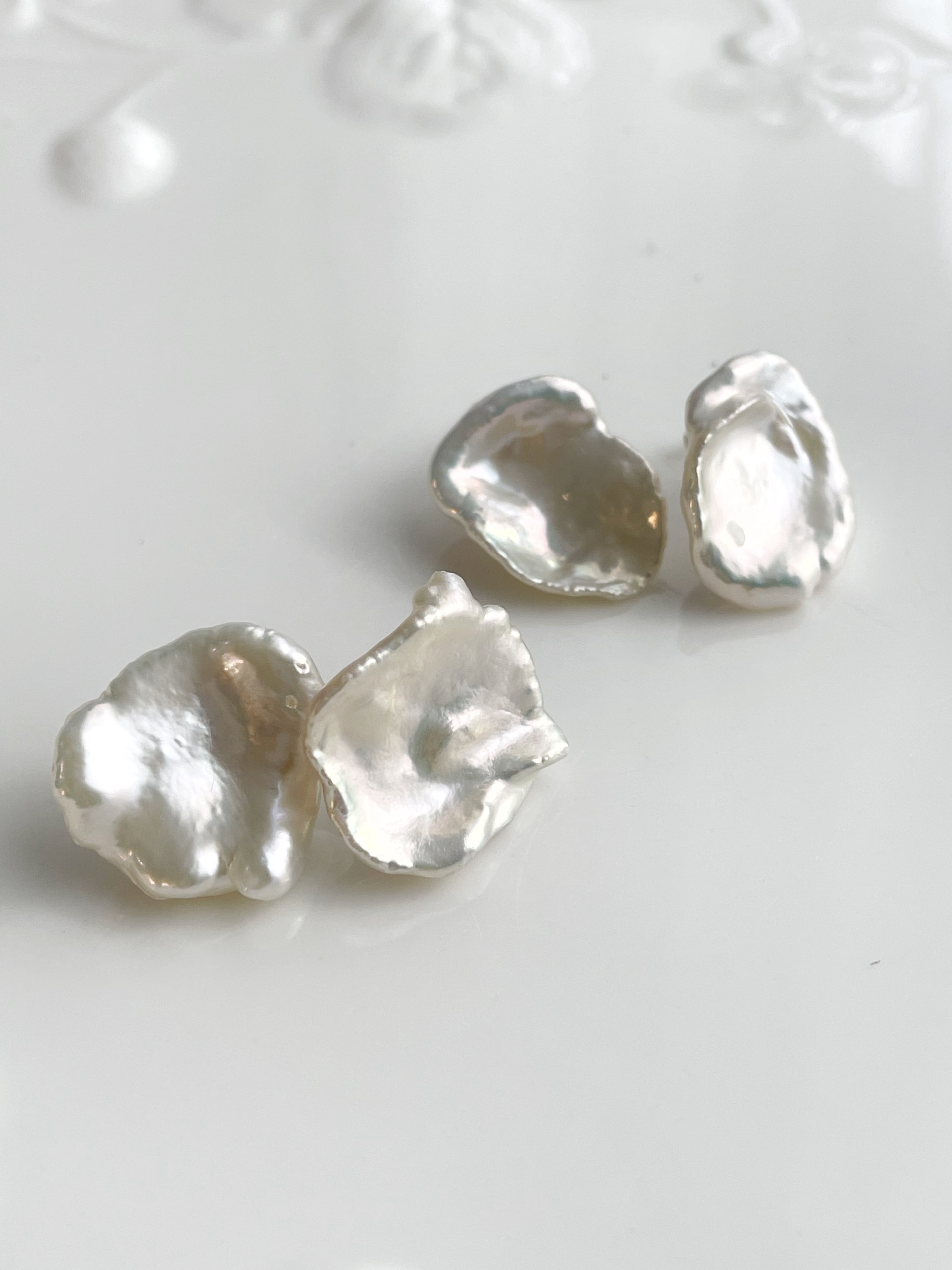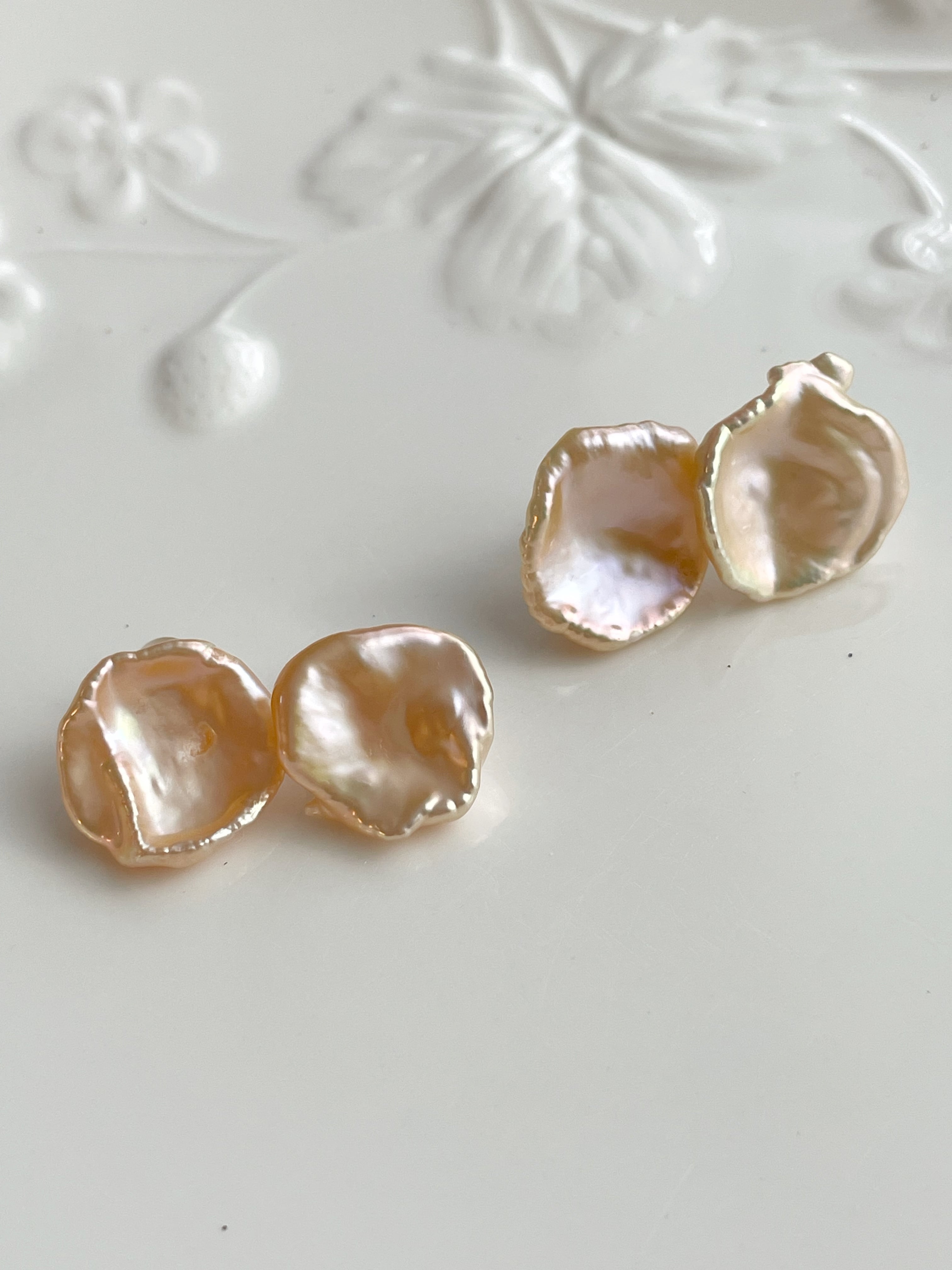可憐なバラの花びらを思わせる形のパールで作られたピアス。