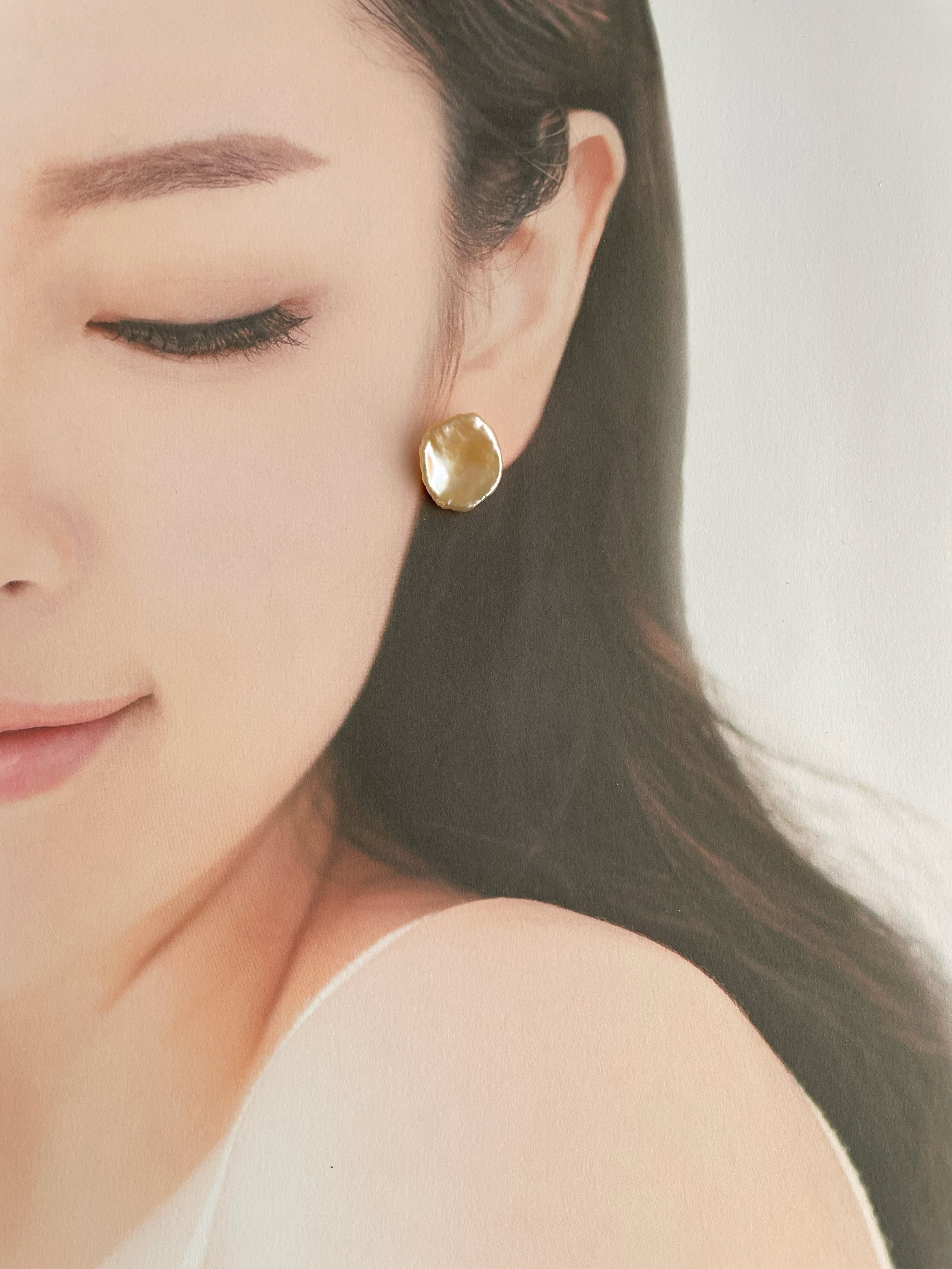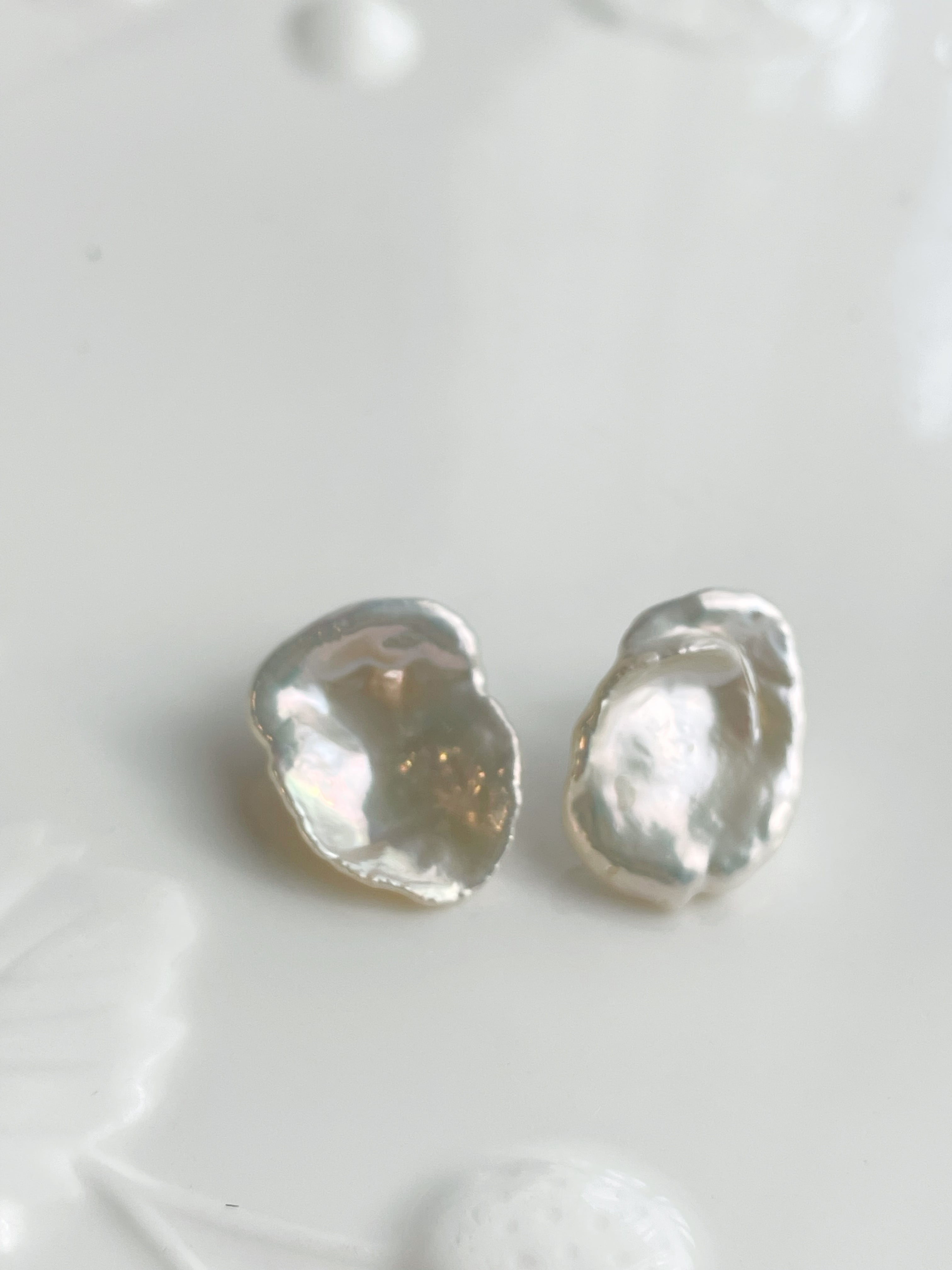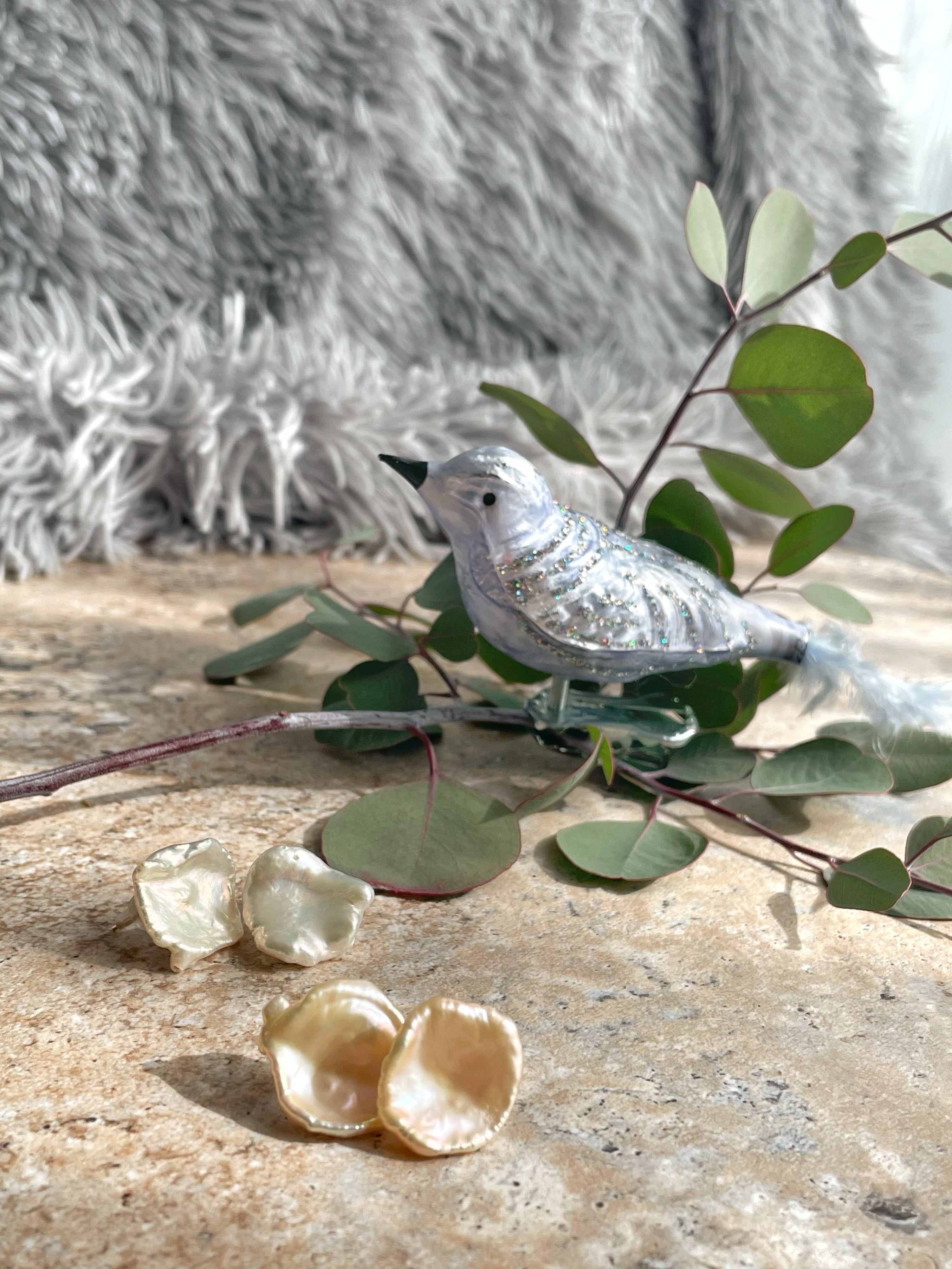 可憐なバラの花びらを思わせる形のパールで作られたピアス。
